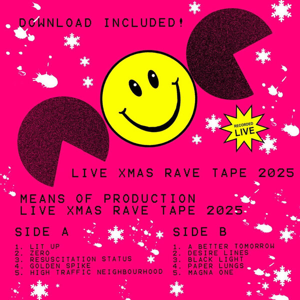Means of Production Xmas 2025 rave tape. Dark electronica with disconcerting lyrics and live videos in performance. Available as a cassette for playing in your car stereo as you whizz round the M25 looking for an address off a dodgy flier.